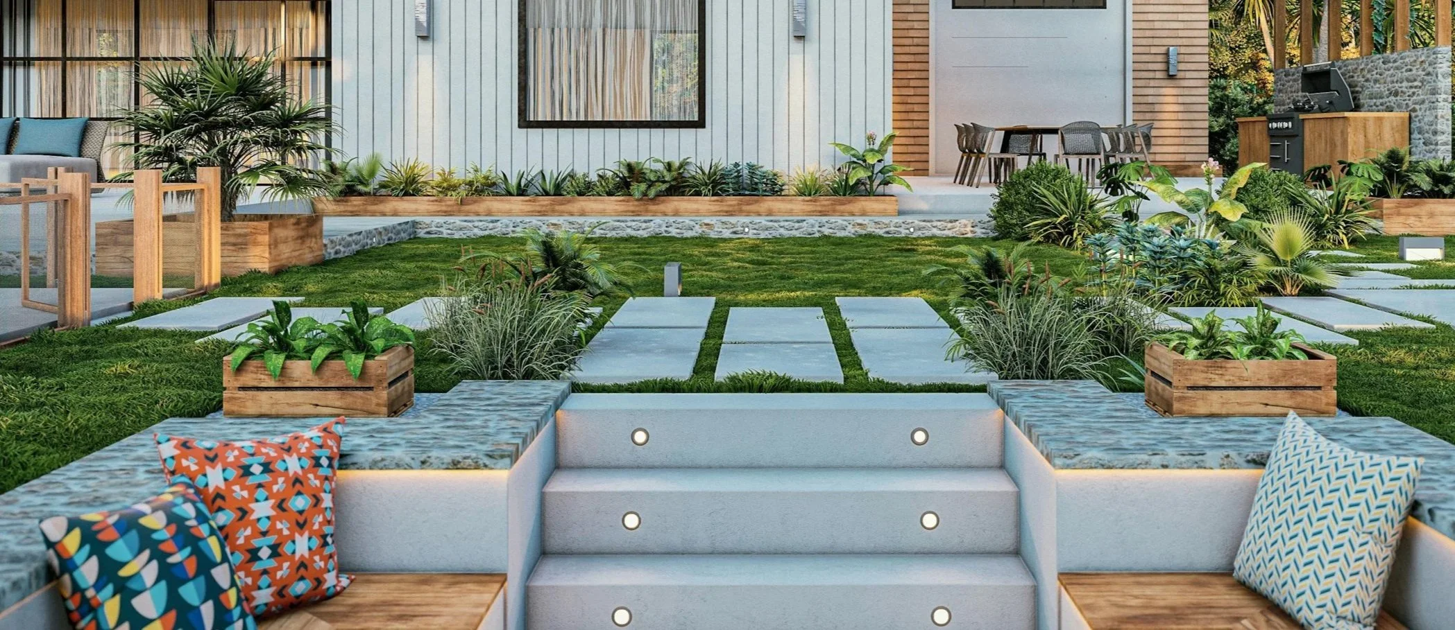 Transform your landscape with clean, modern hardscapes. From pavers to turf and softscape details, we build spaces made to last.